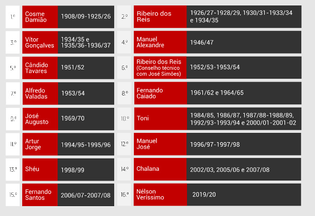 Doze anos depois, o 16.º nome. Nélson Veríssimo (foto) ocupou o lugar de Bruno Lage – de quem era adjunto – e assumiu o comando técnico da equipe para a temporada 2019/2020. Vão ser seis jogos (cinco para a Liga NOS e um para a Taça de Portugal), e estreou ganhando de 3 a 1 do Boavista.