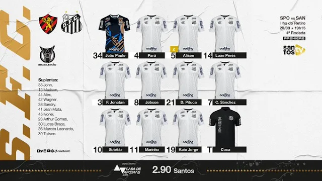 O jogo foi válido pela quarta rodada do Brasileirão Assaí 2020. O Santos foi a sete pontos e pulou para terceira colocação. O Sport estacionou em quatro pontos, na 14ª posição.