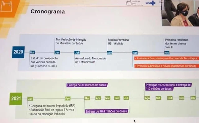 - A presidente da Fundação Osvaldo Cruz (Fiocruz), Nísia Trindade, também presente à reunião, informou que a previsão é de que, no final de janeiro de 2021, deverão ser entregues as primeiras 30 milhões de doses da Vacina produzida em parceria com a Universidade de Oxford.