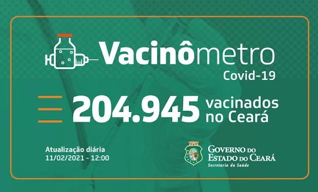 O Vacinômetro da Secretaria de Saúde do Ceará(Sesa) informa que até o meio-dia de quinta-feira (11) quase 205 mil (204.945) cearenses receberam a primeira dose da Vacina contra o Coronavírus.