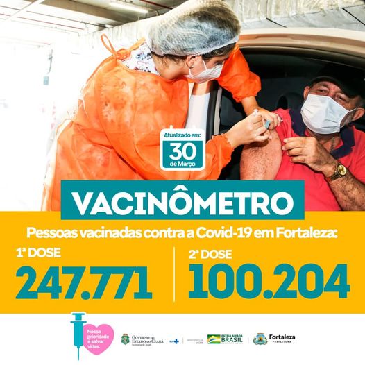 Fortaleza ultrapassou nesta terça-feira (30 de março) a marca de 100 mil segunda dose aplicadas contra a Covid-19. Já são 100.304 pessoas que receberam a segunda dose em Fortaleza. Quanto a primeira dose 247.771 pessoas foram vacinadas. Com isso Fortaleza chega a 347.975 doses aplicadas de Vacinas Anti Covid-19 (Novo Coronavírus).