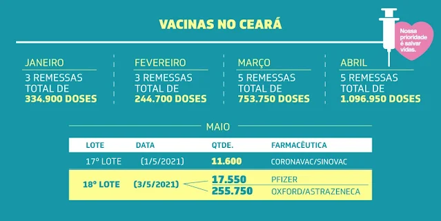 - Recebemos há pouco mais um lote de vacinas contra a Covid, incluindo mais uma remessa da AstraZeneca e a primeira da Pfizer. Temos lutado muito para que os cearenses sejam vacinados o quanto antes. Hoje mesmo a Justiça Federal acatou ação do Governo do Estado para que o Ceará receba, de forma imediata, 49 mil doses extras da vacina CoronaVac. Não vou descansar um minuto até que toda nossa população seja imunizada”, ressaltou o governador Camilo Santana.