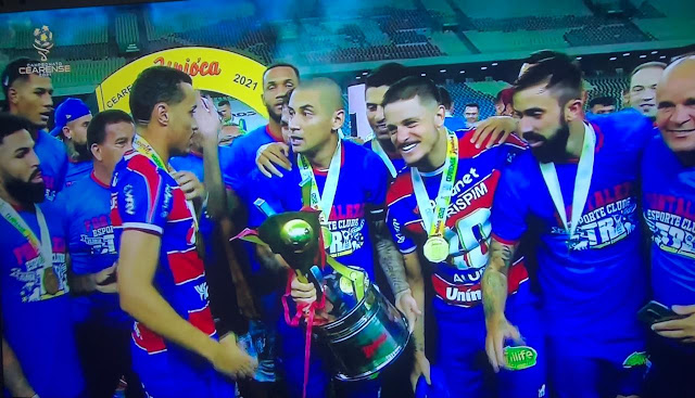 O Fortaleza (fotos Carmen Pompeu-reprodução TV Jangadeiro) é campeão cearense de 2021.