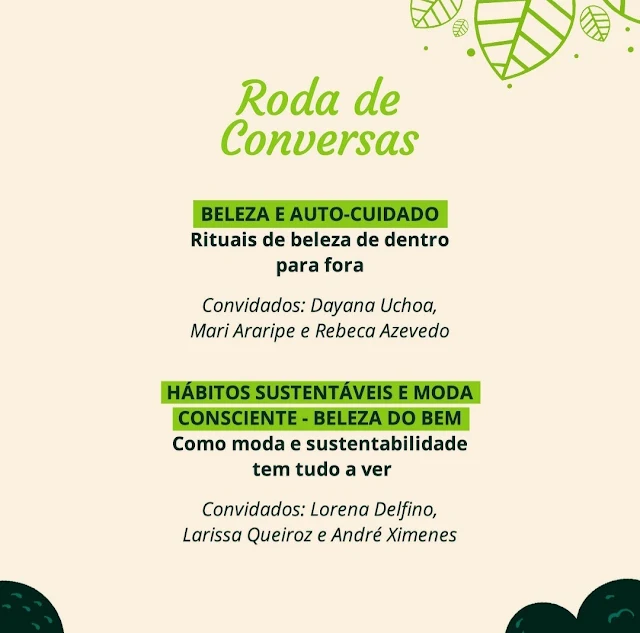 A roda de conversas aborda temas como beleza e autocuidado, hábitos sustentáveis e moda consciente – beleza do bem, alimentação saudável e sustentável, e maternidade sustentável.