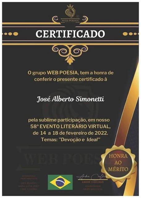 O jornalista e novelista José Alberto Simonetti ganhou certificado do Grupo Web Poesia: