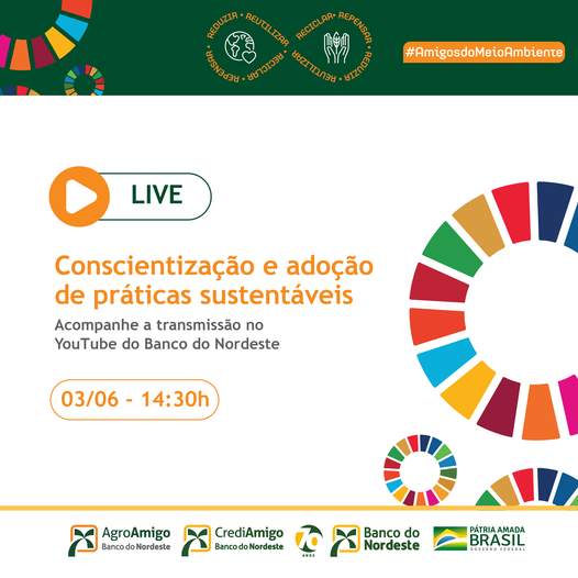 O Banco do Nordeste do Brasil (BNB) realiza, nesta sexta-feira (3 de junho), às 14h30, a Palestra Virtual 'Amigos do Meio Ambiente' sobre uso consciente de Recursos Hídricos e linhas de crédito voltadas a Projetos Produtivos que envolvam Práticas de Sustentabilidade.