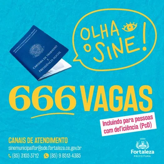 O Sistema Nacional do Emprego (Sine) oferta nesta semana 666 vagas de trabalho em diversas áreas de Fortaleza, incluindo para Pessoas com deficiência (PcD).
