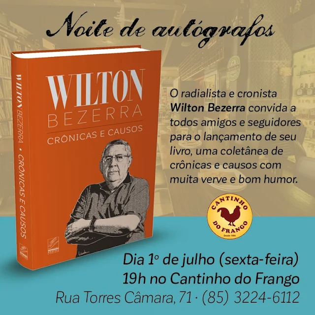 - 19 horas - Lançamento do Livro 'Wilton Bezerra-Crônicas e Causos', no Cantinho de Frango (Rua Torres Câmara, 71 - Aldeota).
