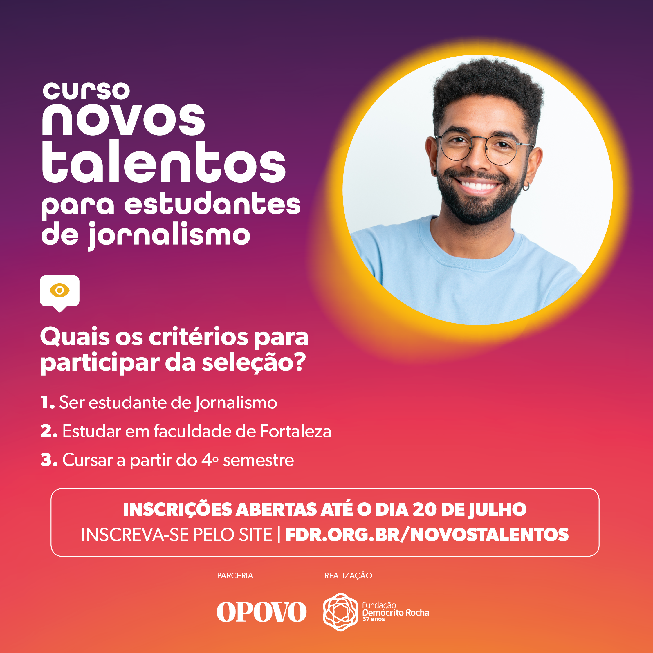 Vão até o meio-dia de quarta-feira (20 de julho) as inscrições para a 29ª Turma do Curso Novos Talentos para Estudantes de Jornalismo, que é realizado pela Fundação Demócrito Rocha (FDR), em parceria com o Grupo de Comunicação O Povo.