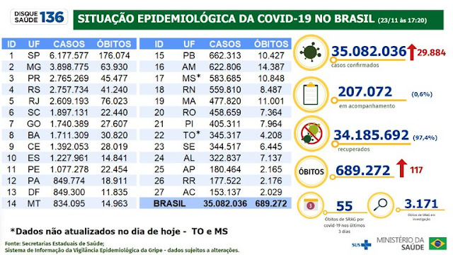 • 35.082.036 infecções, sendo 29.884 registradas nesta quarta (23).