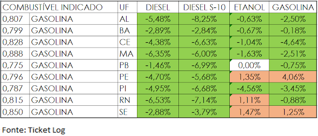 A última análise do Índice de Preços Ticket Log (IPTL), apontou que a Região Nordeste fechou a primeira quinzena de junho com o litro do etanol a R$ 4,51, após redução de 0,44% se comparado a maio. Já a gasolina foi vendida a R$ 5,59 o litro, após recuo de 1,06%. O diesel comum e o S-10 fecharam o período a R$ 5,18 e R$ 5,16, com redução de 4,07% e 5,32%, respectivamente.
