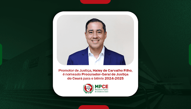 Nomeação-O governador do Ceará, Elmano de Freitas (PT), nomeou, na sexta-feira (22/12/2023), Haley de Carvalho Filho para o cargo de procurador-geral de Justiça – biênio 2024-2025. O promotor de Justiça recebeu 219 votos na Eleição interna realizada entre membros do Ministério Público do Estado do Ceará (MPCE) em 1º/12/2023.