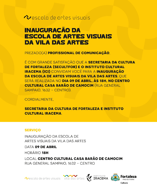 O Complexo Vila das Artes celebra, nesta terça-feira (9/4/2024), às 18 horas, na Casa Barão de Camocim, a inauguração de mais um equipamento público muito aguardado pela comunidade artística: a Escola Pública de Artes Visuais. A inauguração contará com a cerimonialista e artista Camilly Leycker, o DJ Jayro Ikari, o caricaturista Jeremias, a grafiteira Dinha Ribeiro e a cantora e performer Gabi Dorato.