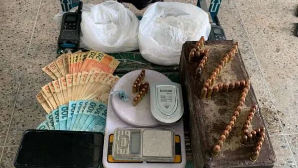 Foram apreendidas 730g de cocaína, 34g de crack, maquinário tipo prensa, rádios, prensa com capacidade de 10 t, além de 81 munições e R$ 2.460,00 em espécie.