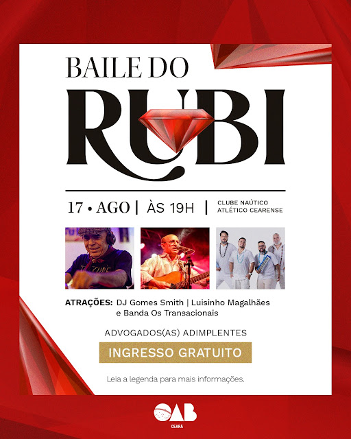 Além do Baile do Rubi, a OAB-CE realizará no dia 31 de agosto a Festa da Advocacia, no Iguatemi Hall, com atrações que serão anunciadas em breve.