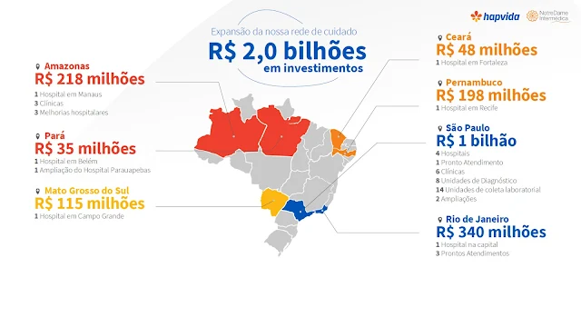 Outras unidades no Brasil: Além de São Paulo, outros estados vão ganhar novas unidades. No Amazonas, serão um hospital e três clínicas. O Rio de Janeiro terá um hospital e três prontos atendimentos, enquanto o Pará contará com um hospital e uma ampliação de unidade. Ceará, Pernambuco e Mato Grosso do Sul terão uma nova unidade hospitalar em cada localidade.