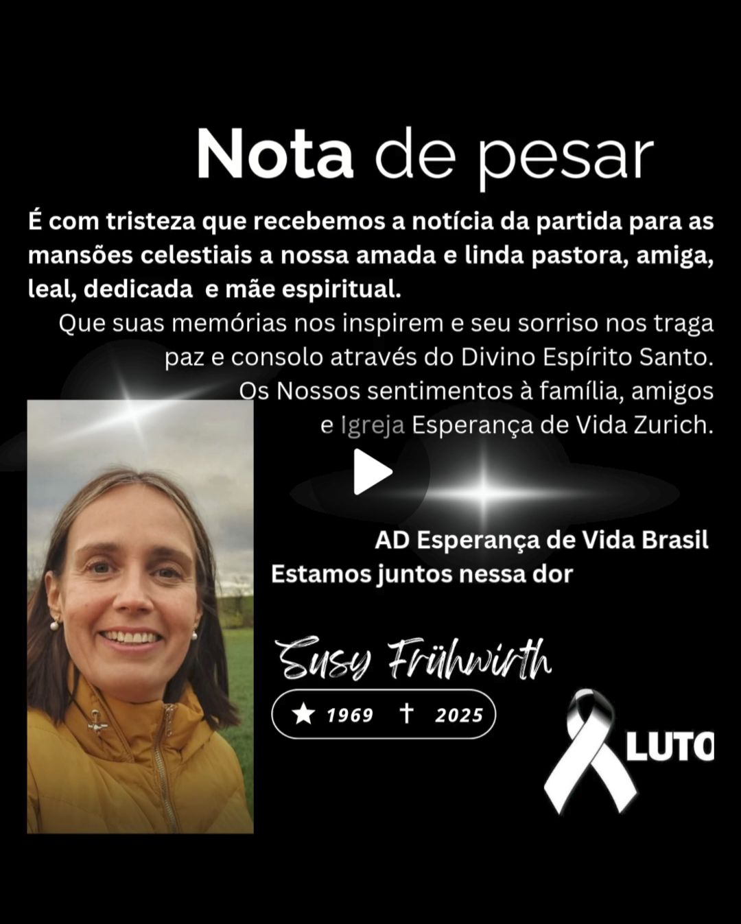- Pastor e radialista Jorge Luiz está se sentindo triste com Instituto Conexão Esperança em Suiça - Zurich. A pastora presidente internacional da Igreja Esperança de Vida, com sede na Suiça, partiu nessa madrugada 26/4/2025, vítima de um Câncer, para as mansões celestiais e a estar para sempre com o Senhor Jesus, pastora Susy Frühwirth, deixando uma lacuna enorme. Nossos sinceros sentimentos e orações pelo pastor Gerardo Frühwirth, Família e Igreja na Suíça. ADEVIB-Assembleia de Deus Esperança de Vida Brasil.